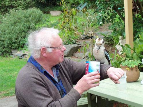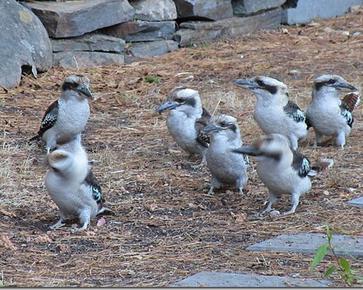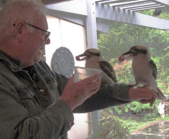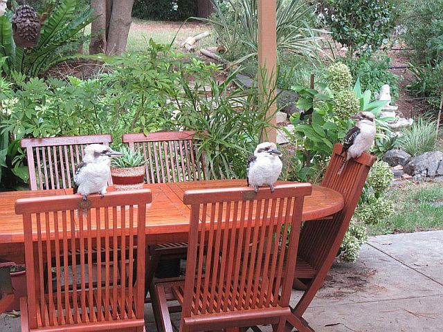My Favorite Kookaburra of 7 years. Daily she waits for me at my door with her now many off spring (see below) and immediately flies to my arm or shoulder.